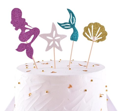 Op zoek naar een leuke zeemeermin taartversiering? Shop dan deze set van 8 grote prikkers (2 van elk). De set bestaat uit een zeemeermin, zeester, zeemeerminnenstaart en een schelp met parel. De prikkers zijn gemaakt van glitter karton. Eventueel ook als zeemeermin cupcake versiering te gebruiken maar dan zijn ze wel aan de grote kant. De schelp, zeester en schelp zijn circa 5 cm breed. De zeemeermin is 6,5 cm breed en 11 cm hoog.
