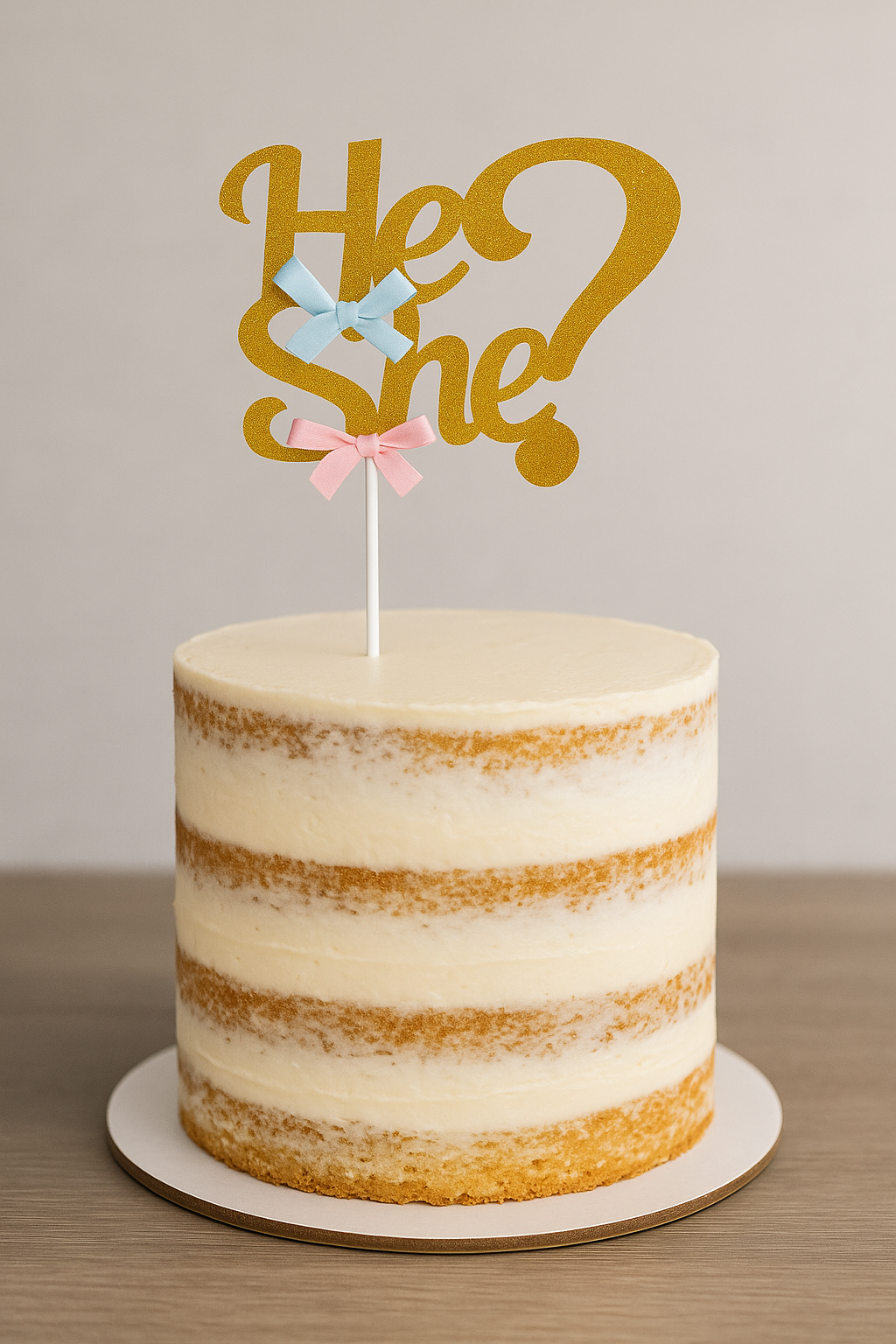 Voeg een vleugje spanning en stijl toe aan je gender reveal feest met deze charmante "He or She" taarttopper, versierd met roze en blauwe strikjes!